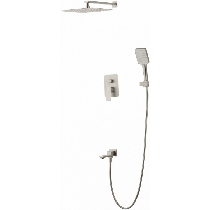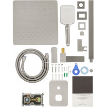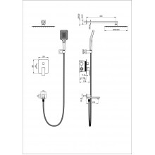 Комплектация: смеситель, душевой шланг, держатель для душа, верхний душ, душевая лейка, монтажный комплект.
