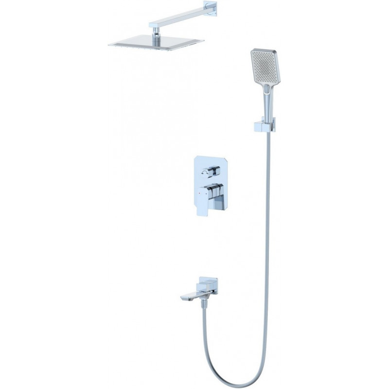 Комплектация: смеситель, душевой шланг, держатель для душа, верхний душ, душевая лейка, монтажный комплект.