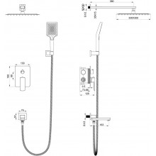 Комплектация: смеситель, душевой шланг, держатель для душа, верхний душ, душевая лейка, монтажный комплект.