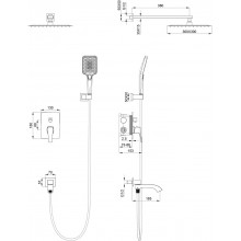 Комплектация: смеситель, душевой шланг, держатель для душа, верхний душ, душевая лейка, монтажный комплект.