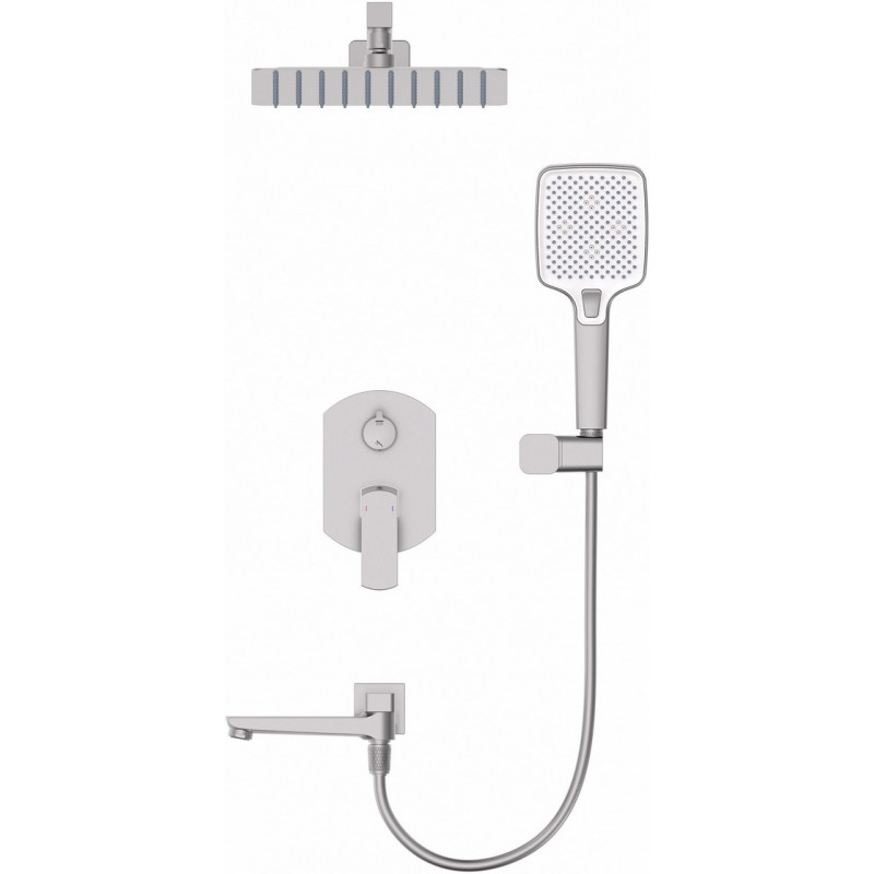 Комплектация: смеситель, душевой шланг, держатель для душа, верхний душ, душевая лейка, монтажный комплект.