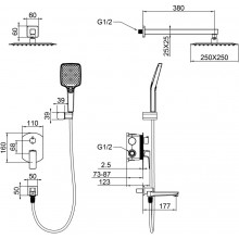 Комплектация: смеситель, душевой шланг, держатель для душа, верхний душ, душевая лейка, монтажный комплект.