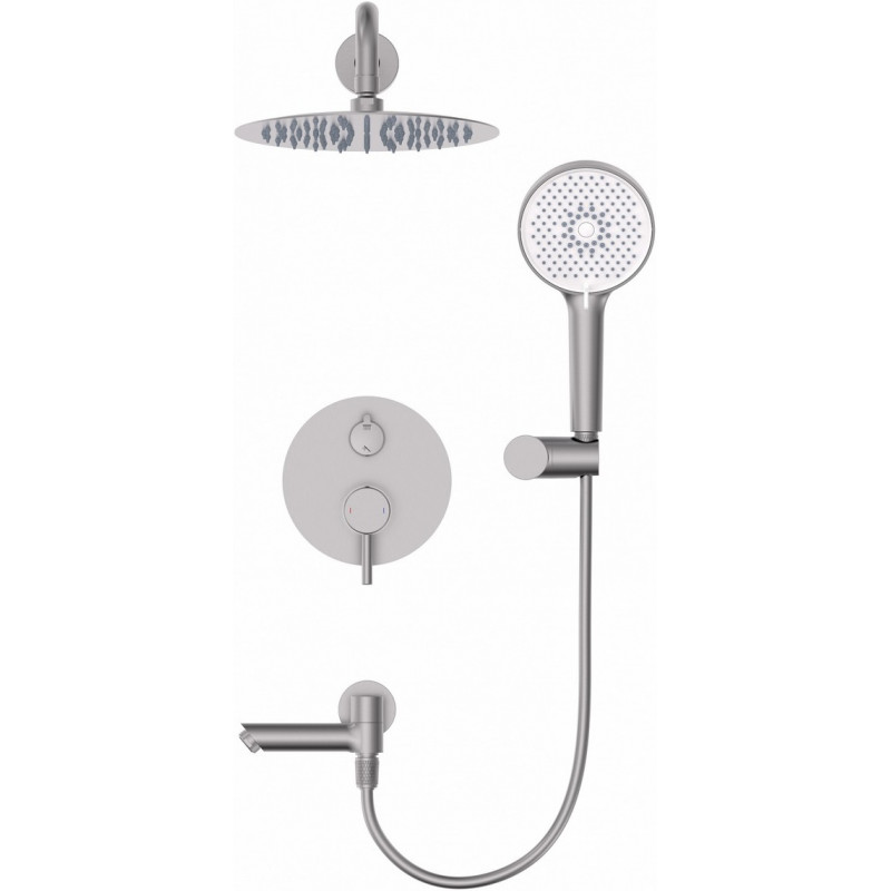 Комплектация: смеситель, душевой шланг, держатель для душа, верхний душ, душевая лейка, монтажный комплект.