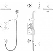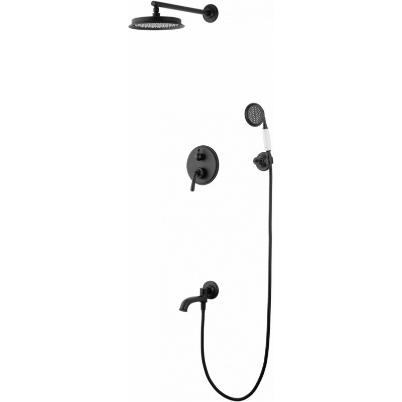Комплектация: смеситель, душевой шланг, держатель для душа, верхний душ, душевая лейка, монтажный комплект.