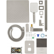 Комплектация: смеситель, душевой шланг, держатель для душа, верхний душ, душевая лейка, монтажный комплект.