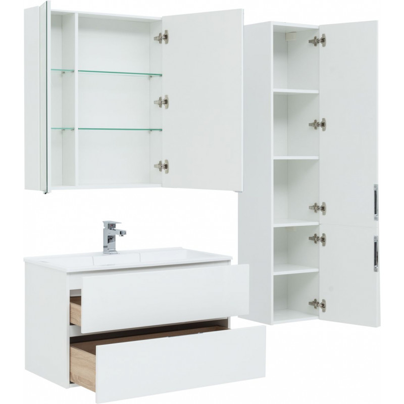 Тумба под раковину Aquanet Алвита 90 (цвет белый) придаст интерьеру ванной комнаты нотку особого очарования и уникальности, благодаря своей нестандартной красивой отделке. Покрытие имеет высокие эксплуатационные характеристики, в частности, влагонепроницаемость, прочность и простоту в уходе. Современный дизайн демонстрирует аккуратный минимализм геометрически четких форм, где основная идея подчинена максимальной функциональности. Вместительная тумба шириной 90 см с верхним и нижним выдвижными ящиками создает дополнительное пространство, где будут надежно скрыты от влаги банные принадлежности. Ящики тумбы закрываются легко и бесшумно, благодаря механизму доводчика.