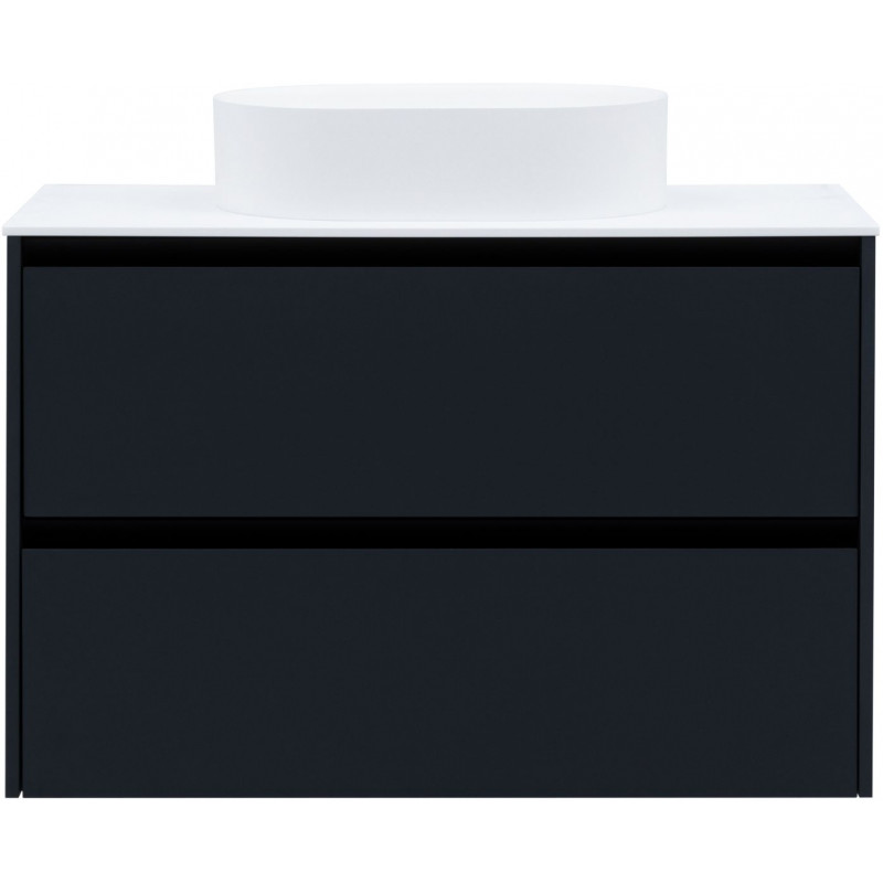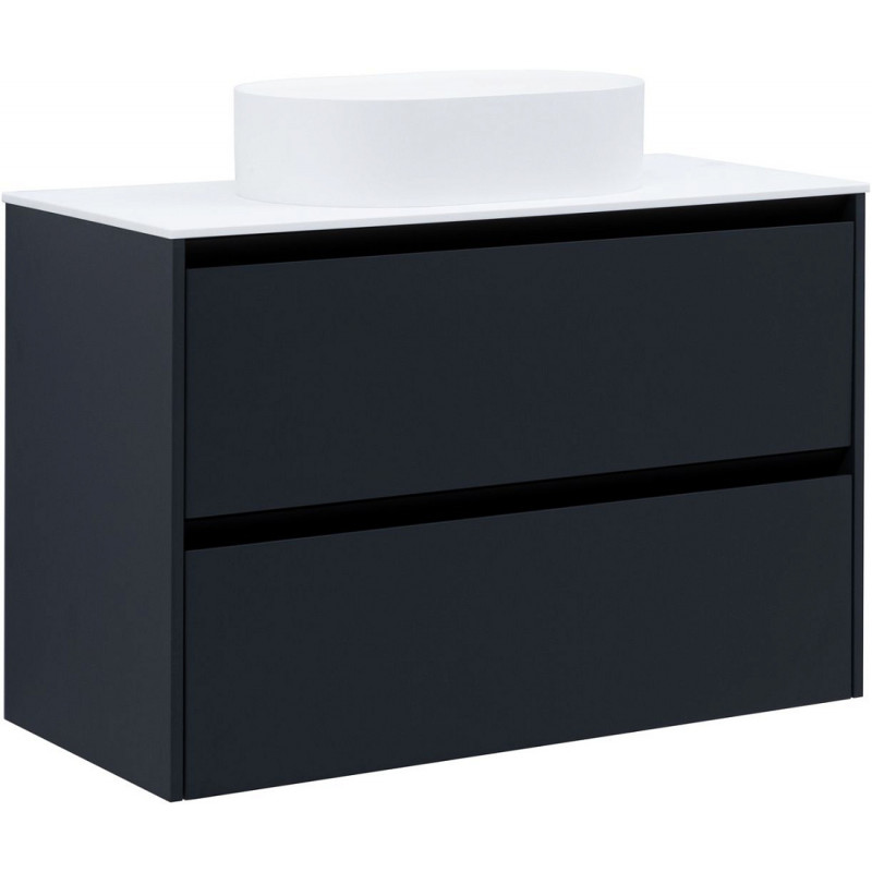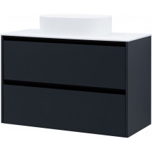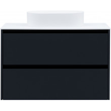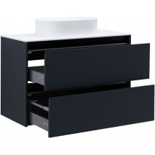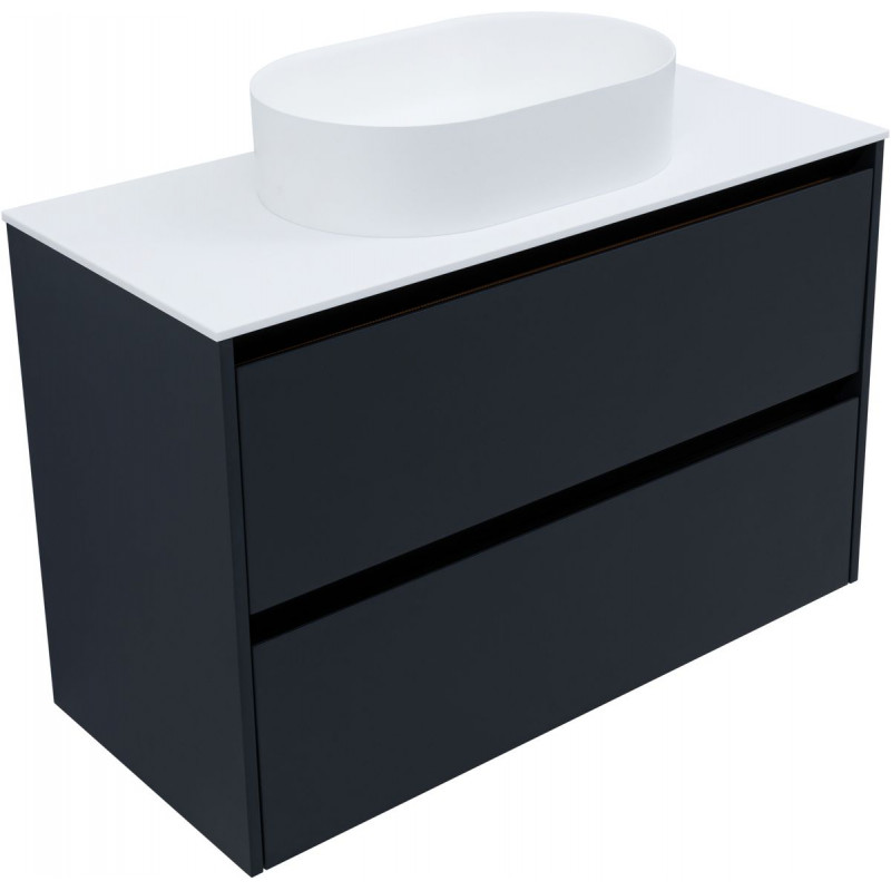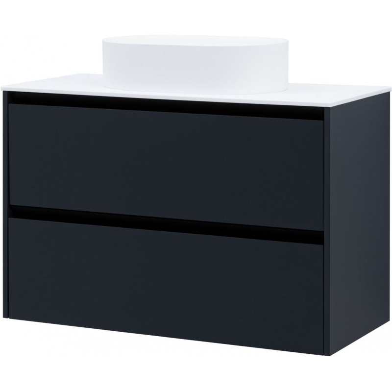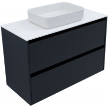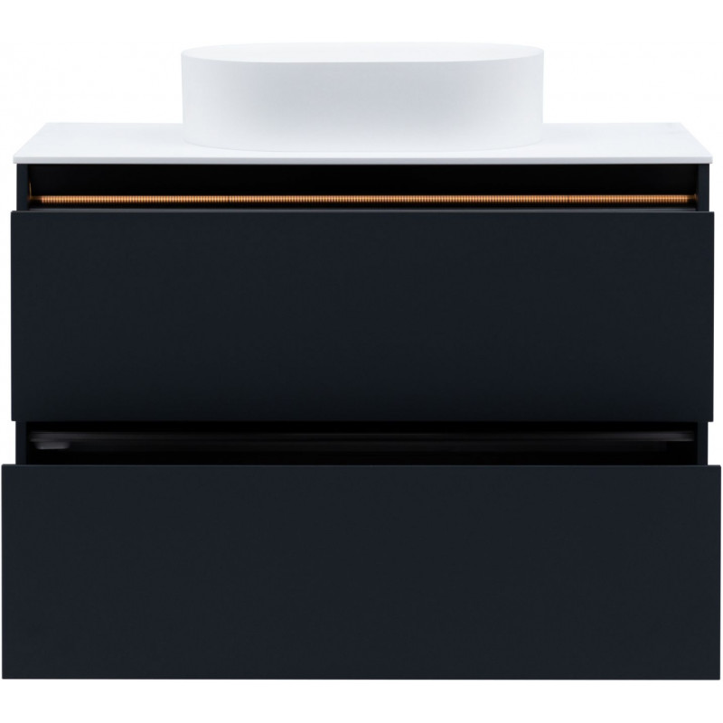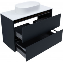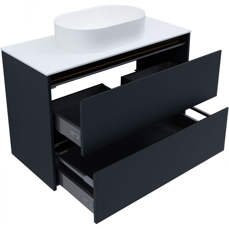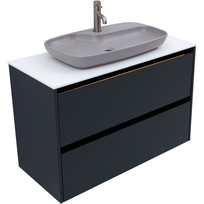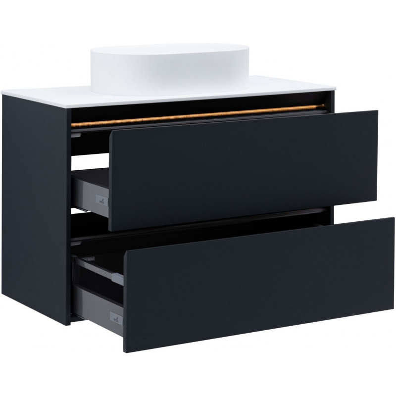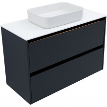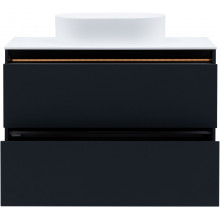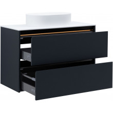 Детали фасада и декоративного профиля установленного на корпусе имеют фрезеровку и наклон 45 градусов, что делает открывание тумбы и пенала очень комфортным. Столешницы из искусственного камня предназначены для установки накладных раковин.