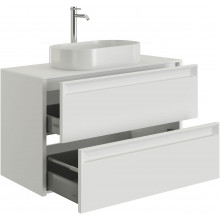 Тумба оснащена специальной пластиковой рамой, которая надежно защищает вырез под сифон, служит органайзером и позволяет закрепить дополнительный набор контейнеров для хранения.