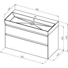 Тумба оснащена направляющими Hettich полного выдвижения. Металлические боковые стенки ящиков повышают прочность. Фасады имеют удобную ручку-фрезеровку на верхнем торце. Пластиковое ограждение сифона позволяет закрепить дополнительные контейнеры для хранения.