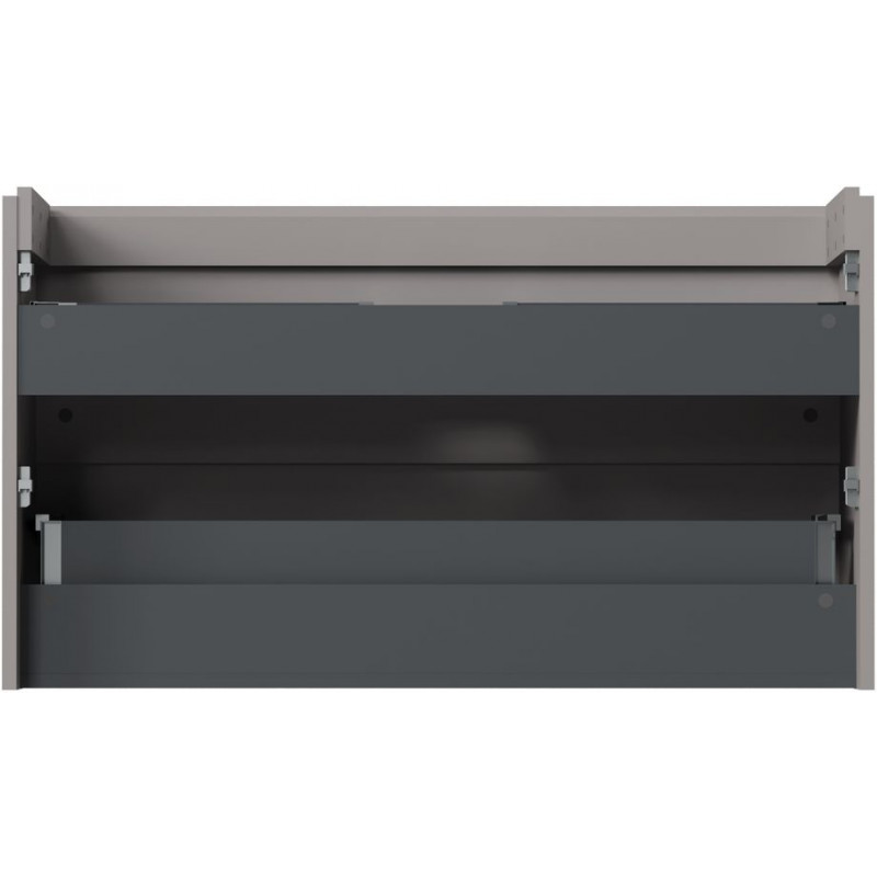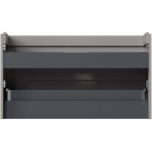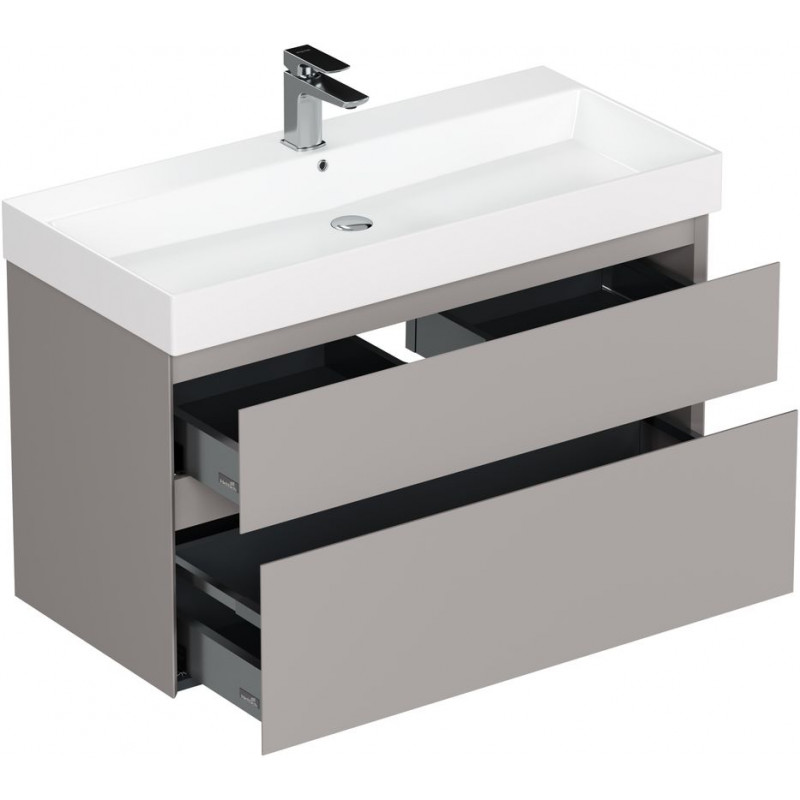 Тумба оснащена направляющими Hettich полного выдвижения. Металлические боковые стенки ящиков повышают прочность. Фасады имеют удобную ручку-фрезеровку на верхнем торце. Пластиковое ограждение сифона позволяет закрепить дополнительные контейнеры для хранения.