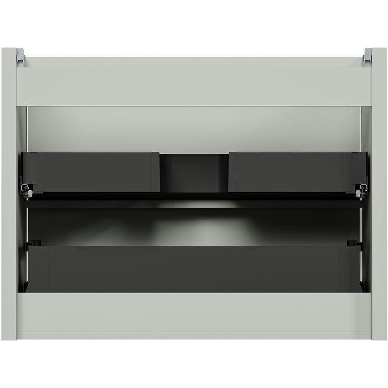 - Оснащение: направляющие Hettich с системой push-to-open (открывание ящиков легким нажатием на фасад) и полным выдвижением, что делает использование тумбы максимально удобным.