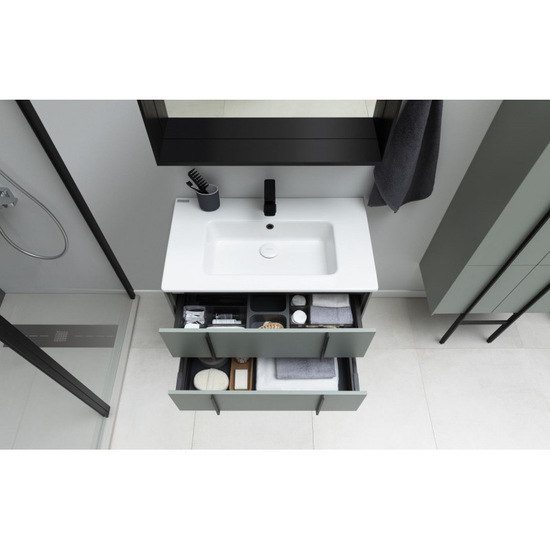 - Тумбы оснащены специальной пластиковой рамой, которая надежно защищает вырез под сифон, служит органайзером и позволяет закрепить дополнительный набор контейнеров для хранения.