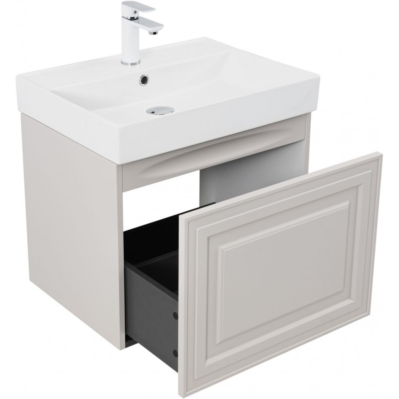 Тумба оснащена вместительным ящиком. Его полезная высота — 380 мм. В дне нет выреза под сифон, что увеличивает полезное пространство. Задняя стенка ящика уменьшена для удобства. Направляющие скрытого монтажа с доводчиками обеспечивают плавное и тихое закрывание. Навесы тумбы выдерживают нагрузку до 130 кг. Это делает конструкцию долговечной. За нижним ящиком предусмотрено место для подводки коммуникаций снизу. Это упрощает монтаж и эксплуатацию.