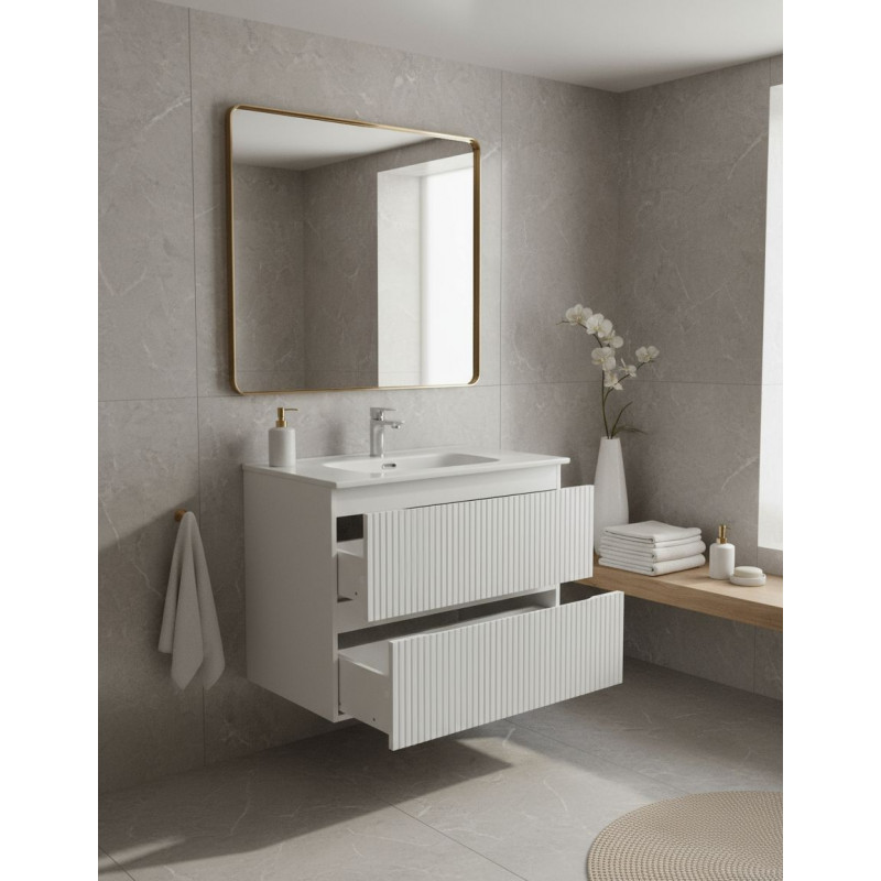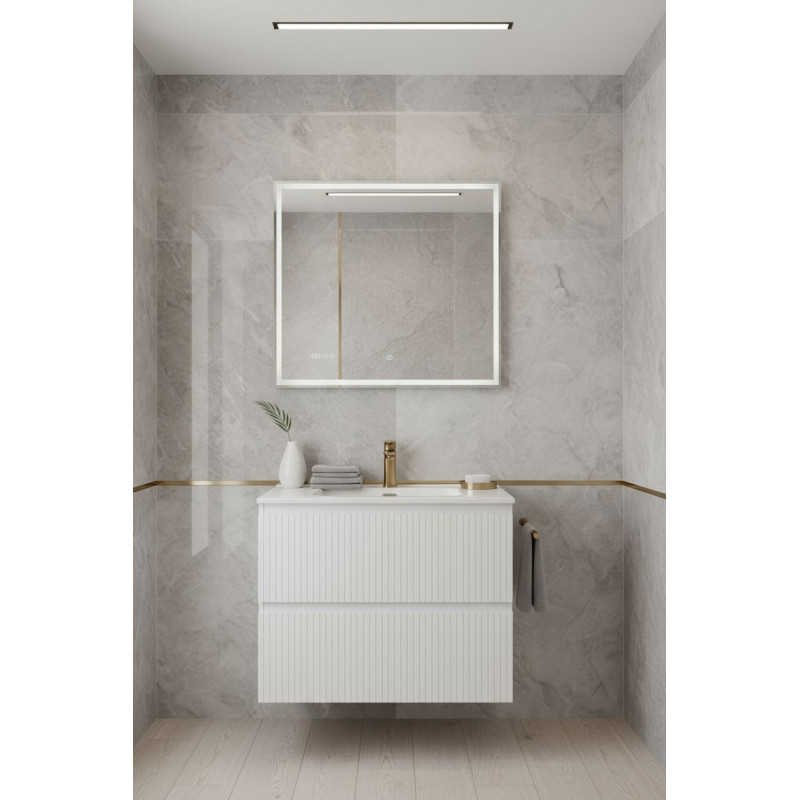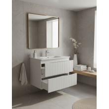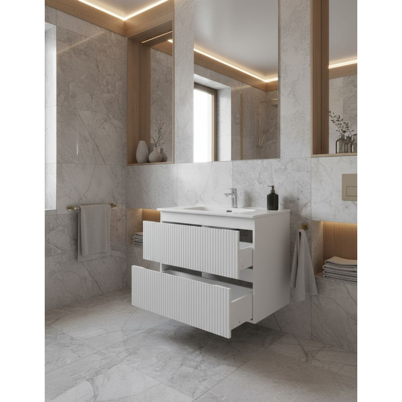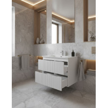 Тумба под раковину Aquanet Джейн 335424 — практичное и стильное решение для ванной комнаты. Корпус и фасады изготовлены из МДФ, покрытого суперматовой пленкой ПВХ повышенной прочности с эффектом «Soft touch». Покрытие не только приятное на ощупь, но и надежно защищает мебель от влаги. Полимерная структура пленки не пропускает воду, поэтому тумба не деформируется со временем и сохраняет первоначальный вид.