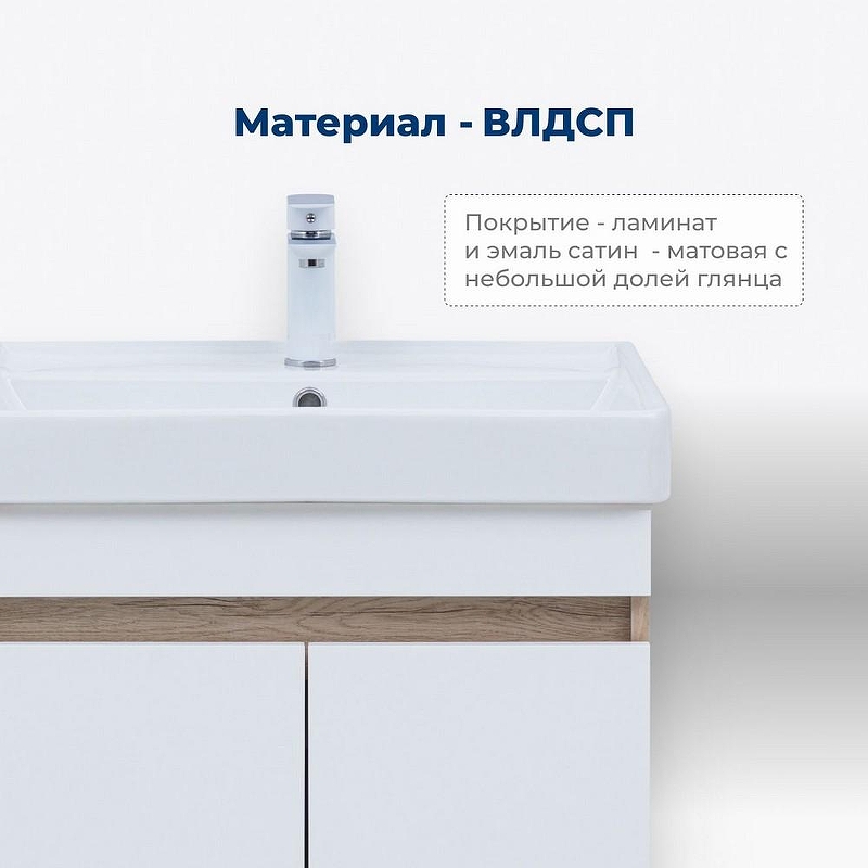 Корпус тумбы выполнен из влагостойкой ЛДСП с ламинированным покрытием, что гарантирует долговечность и устойчивость к воздействию влаги. Фасады также изготовлены из влагостойкой ЛДСП, обеспечивая единый стиль и надежную защиту от деформации.