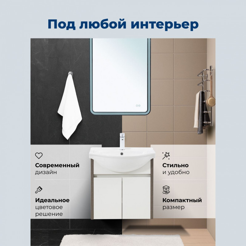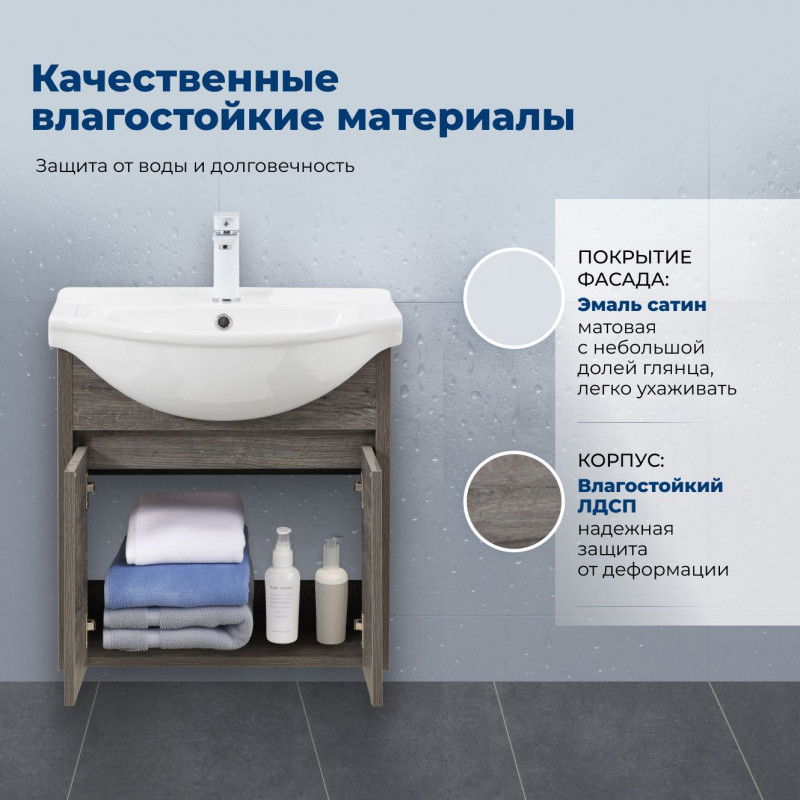 Практичные влагостойкие материалы обеспечивают долгий срок службы даже в условиях повышенной влажности. Пространство под тумбой организовано с учетом необходимости подвода коммуникаций, что делает монтаж удобным и быстрым.