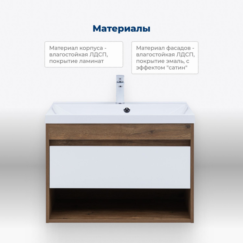 Эта универсальная модель, выполненная в современном стиле, станет гармоничным дополнением любой ванной комнаты. Корпус тумбы изготовлен из влагостойкой ЛДСП, покрытой ламинатом, что гарантирует долговечность и устойчивость к воздействию влаги.