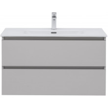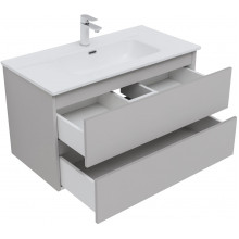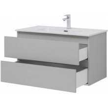 Фасады и корпуса из суперматовой пленки ПВХ обладают повышенной прочностью и эффектом «Soft touch», обеспечивая не только прекрасный внешний вид, но и приятные тактильные ощущения. Тумба оснащена двумя ящиками с механизмом доводчика, что обеспечивает плавное и бесшумное закрытие, а также высокую функциональность.