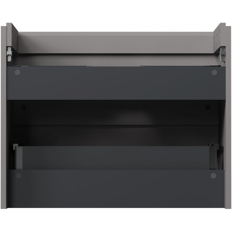 Тумба оснащена направляющими Hettich полного выдвижения. Металлические боковые стенки ящиков повышают прочность. Фасады имеют удобную ручку-фрезеровку на верхнем торце. Пластиковое ограждение сифона позволяет закрепить дополнительные контейнеры для хранения.