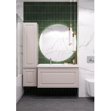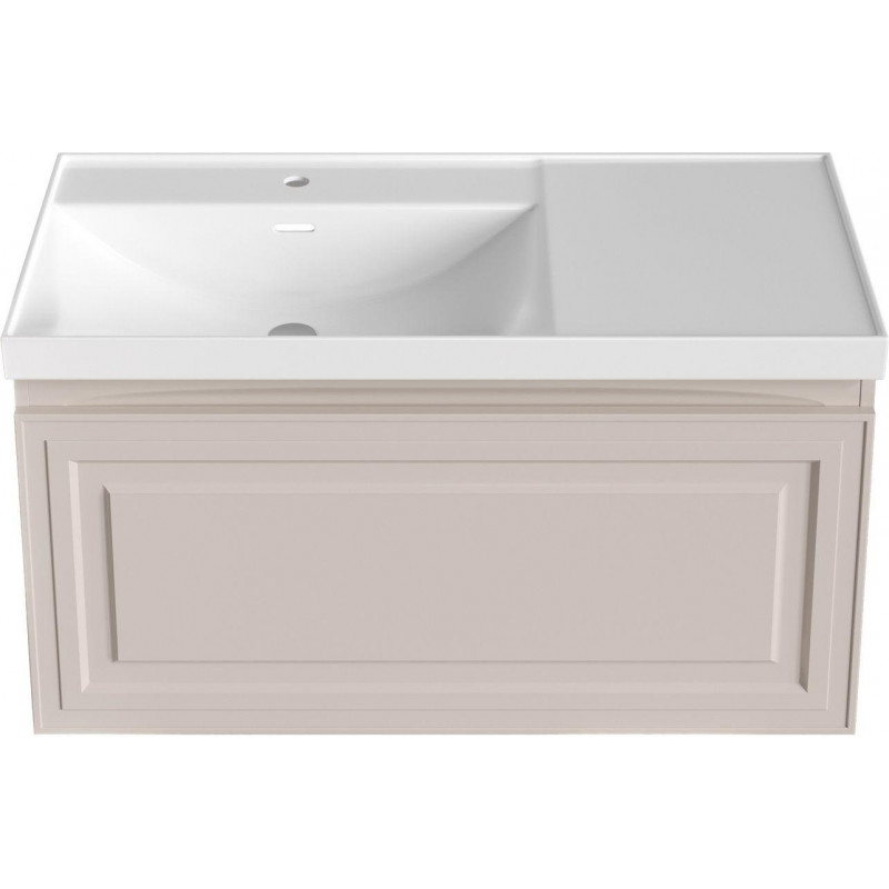 Тумба оснащена вместительным ящиком. Его полезная высота — 380 мм. В дне нет выреза под сифон, что увеличивает полезное пространство. Задняя стенка ящика уменьшена для удобства. Направляющие скрытого монтажа с доводчиками обеспечивают плавное и тихое закрывание. Навесы тумбы выдерживают нагрузку до 130 кг. Это делает конструкцию долговечной. За нижним ящиком предусмотрено место для подводки коммуникаций снизу. Это упрощает монтаж и эксплуатацию.
