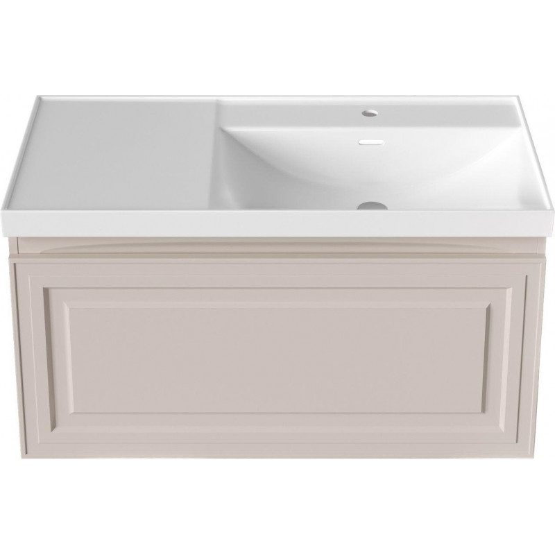 Тумба оснащена вместительным ящиком. Его полезная высота — 380 мм. В дне нет выреза под сифон, что увеличивает полезное пространство. Задняя стенка ящика уменьшена для удобства. Направляющие скрытого монтажа с доводчиками обеспечивают плавное и тихое закрывание. Навесы тумбы выдерживают нагрузку до 130 кг. Это делает конструкцию долговечной. За нижним ящиком предусмотрено место для подводки коммуникаций снизу. Это упрощает монтаж и эксплуатацию.
