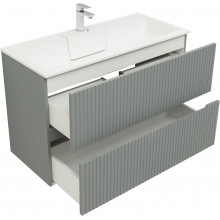 Тумба с раковиной Aquanet Джейн 313320/222717 — практичное и стильное решение для ванной комнаты. Корпус и фасады изготовлены из МДФ, покрытого суперматовой пленкой ПВХ повышенной прочности с эффектом «Soft touch». Покрытие не только приятное на ощупь, но и надежно защищает мебель от влаги. Полимерная структура пленки не пропускает воду, поэтому тумба не деформируется со временем и сохраняет первоначальный вид.