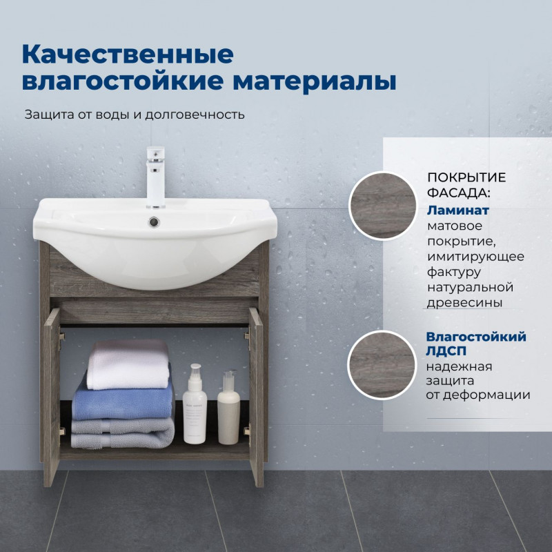 Эта модель - отличный выбор для тех, кто ищет компактную, надежную и стильную тумбу под раковину по доступной цене. Она идеально подойдет для небольших семейных ванных или гостевых санузлов.
