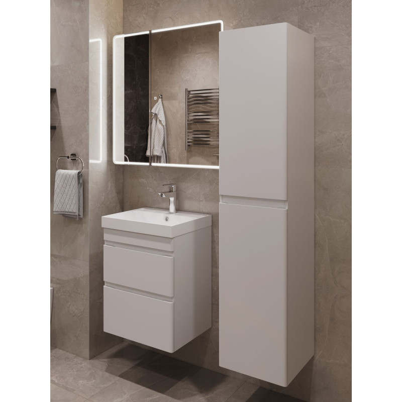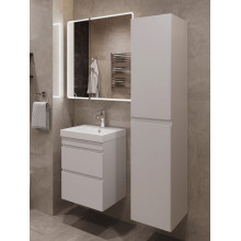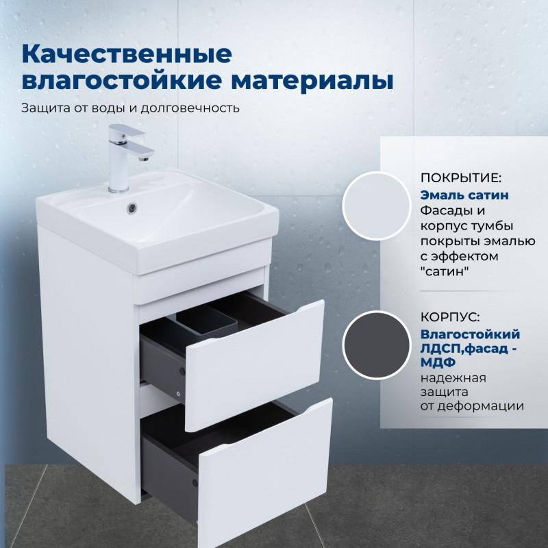 Корпус выполнен из влагостойкой ЛДСП с покрытием эмаль в цвете белый сатин. Фасады изготовлены из МДФ с таким же покрытием. Эмаль с эффектом "сатин" придаёт поверхности лёгкий благородный блеск. Такое покрытие устойчиво к загрязнениям и отпечаткам пальцев. Уход за фасадами не требует усилий.