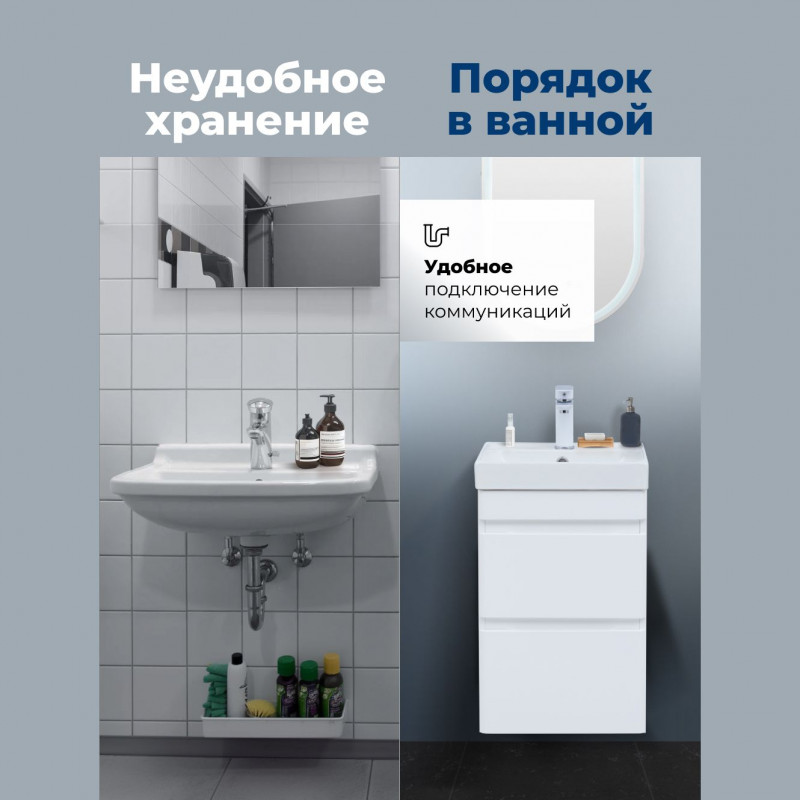 За нижним ящиком предусмотрено место для подводки коммуникаций снизу. Это упрощает монтаж и скрывает трубы. Подвесные модели можно установить на универсальные опоры высотой 200 мм.