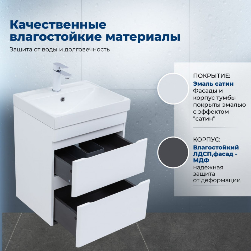 Тумба с раковиной Aquanet Слим 50 белый сатин – компактное и функциональное решение для ванной комнаты. Она сочетает лаконичный дизайн и продуманные детали. Глубина тумбы с раковиной составляет 405 мм, что делает её удобной даже для небольших помещений.