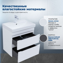 Корпус выполнен из влагостойкой ЛДСП с покрытием эмаль в цвете белый сатин. Фасады изготовлены из МДФ с таким же покрытием. Эмаль с эффектом "сатин" придаёт поверхности лёгкий благородный блеск. Такое покрытие устойчиво к загрязнениям и отпечаткам пальцев. Уход за фасадами не требует усилий.