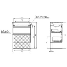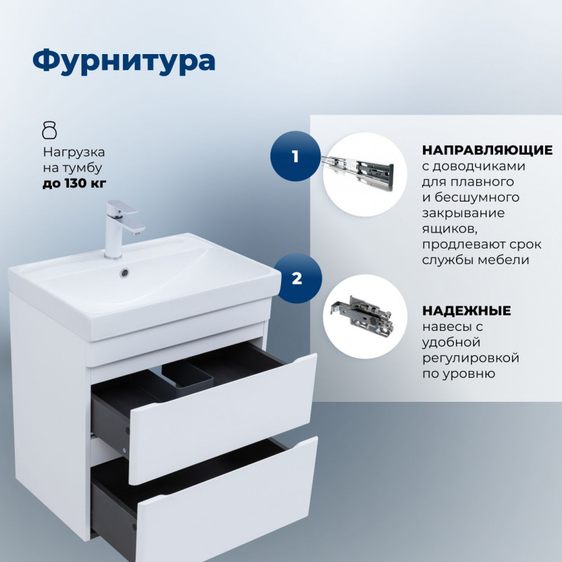 За нижним ящиком предусмотрено место для подводки коммуникаций снизу. Это упрощает монтаж и скрывает трубы. Подвесные модели можно установить на универсальные опоры высотой 200 мм.