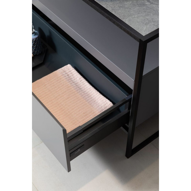 • Выдвижные ящики с металлическими боковыми стенками в цвете серый металлик.
