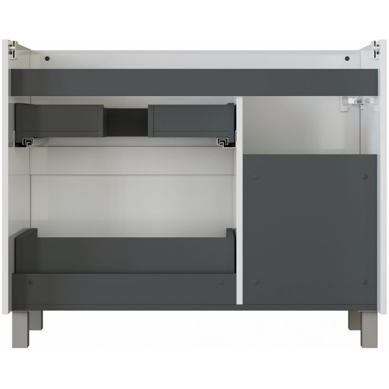 Конструкция тумбы включает два выдвижных ящика и распашную дверцу справа, что обеспечивает удобное хранение. Внутреннее пространство выполнено из влагостойкой ЛДСП в цвете антрацит, создавая стильный контраст с фасадами.
