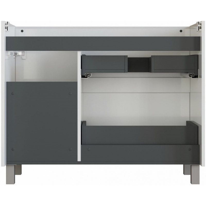 Конструкция тумбы включает два выдвижных ящика и распашную дверцу слева, что обеспечивает удобное хранение. Внутреннее пространство выполнено из влагостойкой ЛДСП в цвете антрацит, создавая стильный контраст с фасадами.