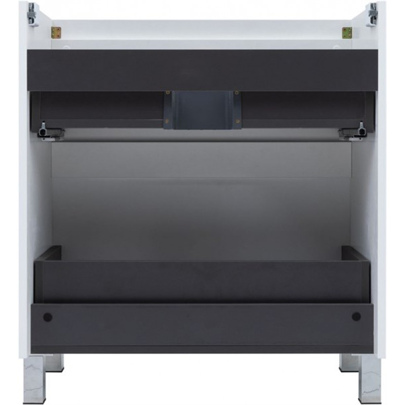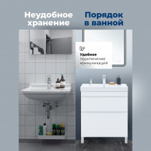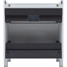 За нижним ящиком предусмотрено место для подводки коммуникаций снизу. Это упрощает монтаж и скрывает трубы. Напольная тумба уже укомплектована четырьмя металлическими опорами.