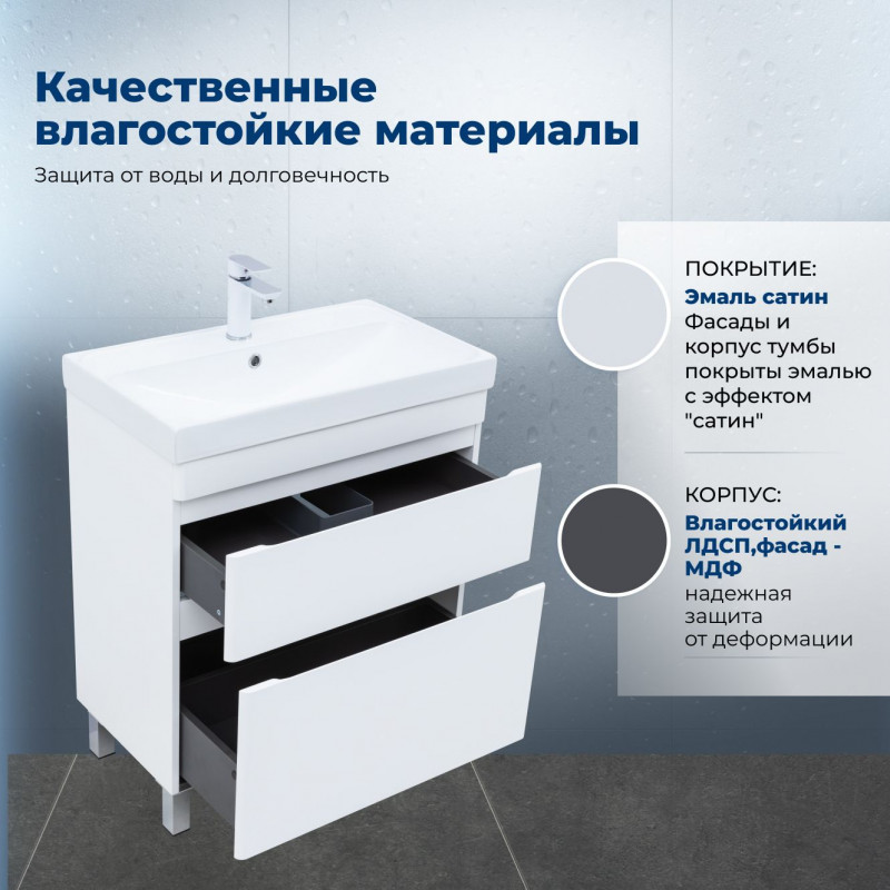 Корпус выполнен из влагостойкой ЛДСП с покрытием эмаль в цвете белый сатин. Фасады изготовлены из МДФ с таким же покрытием. Эмаль с эффектом "сатин" придаёт поверхности лёгкий благородный блеск. Такое покрытие устойчиво к загрязнениям и отпечаткам пальцев. Уход за фасадами не требует усилий.