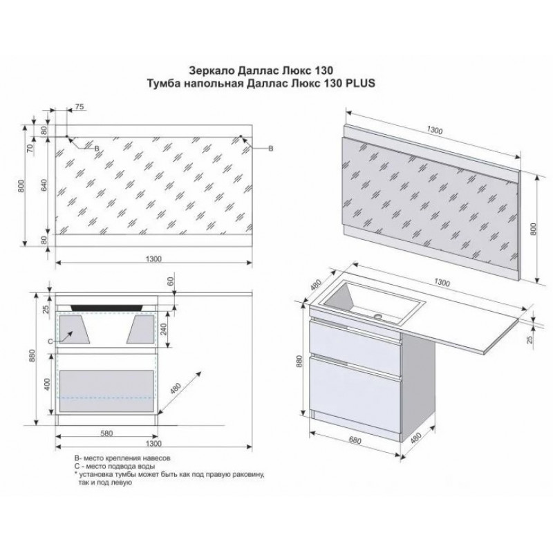 Подвесная конструкция. Крепится к капитальной стене на анкерах. Стиральная машина стоит на полу, а тумба лишь закрывает ее. Такая мебель позволяет удобно выполнять уборку пола вокруг стиралки, а в случае протечки воды дает возможность быстрого ее удаления. Качество. Мебель изготавливается на современном оборудовании. Продукция проходит обязательный контроль качества на каждом этапе производства. Практичность. Мебель выполнена из влагостойкого ЛДСП и МДФ. Комфорт. Ящики снабжены системой плавного закрывания, большая рабочая поверхность раковины, стиральная машина устанавливается под столешницу раковины. Цветовое решение. Возможное сочетание разных цветов в одном изделии позволит Вам создать неповторимое дизайнерское решение. Умывальник Даллас 1300*482, левый/правый