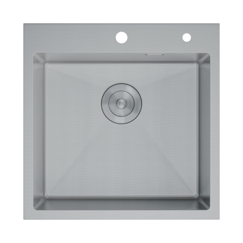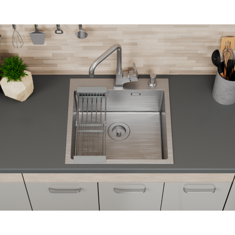 Поверхность мойки - брашированная. Во время процесса браширования ворсинки щетки двигаются по поверхности мойки, что создает равномерную текстуру с узором с легким блеском. Одно из главных преимуществ брашировки поверхности мойки состоит в том, что на ней практически не заметны следы воды и мелкие царапины.