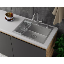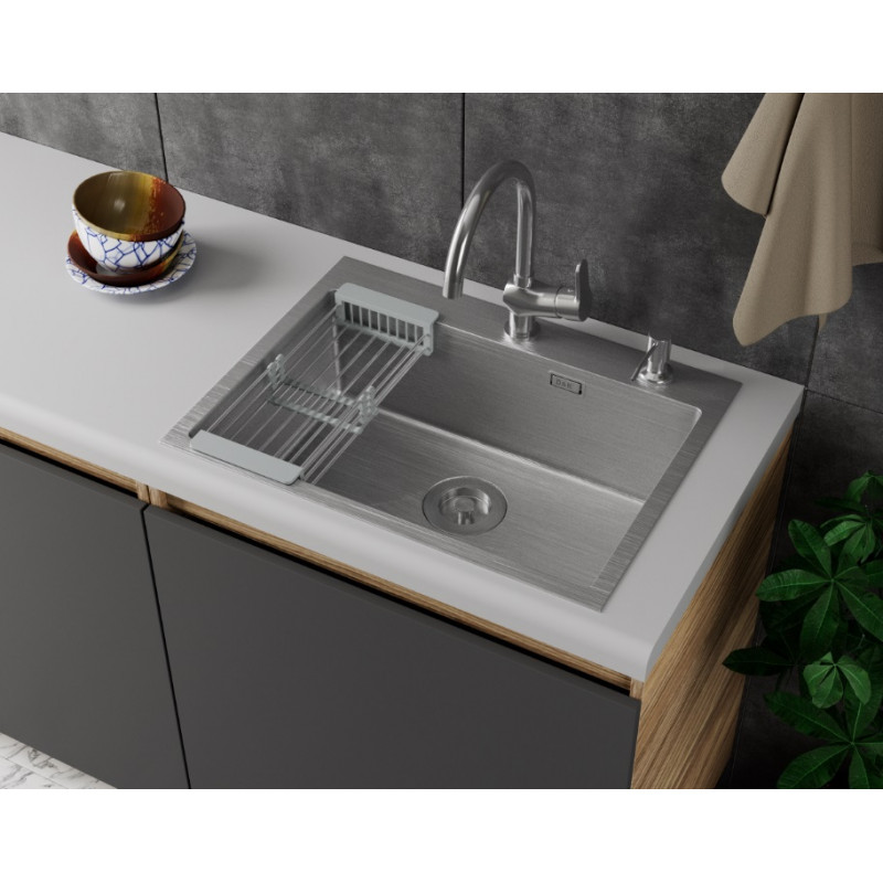 Поверхность мойки - брашированная. Во время процесса браширования ворсинки щетки двигаются по поверхности мойки, что создает равномерную текстуру с узором с легким блеском. Одно из главных преимуществ брашировки поверхности мойки состоит в том, что на ней практически не заметны следы воды и мелкие царапины.