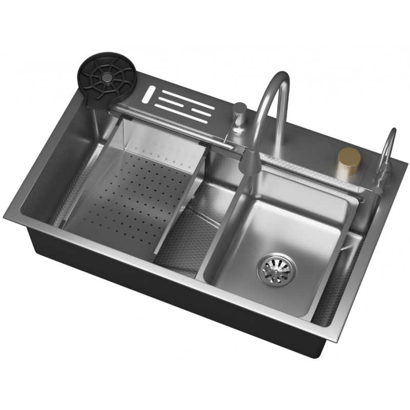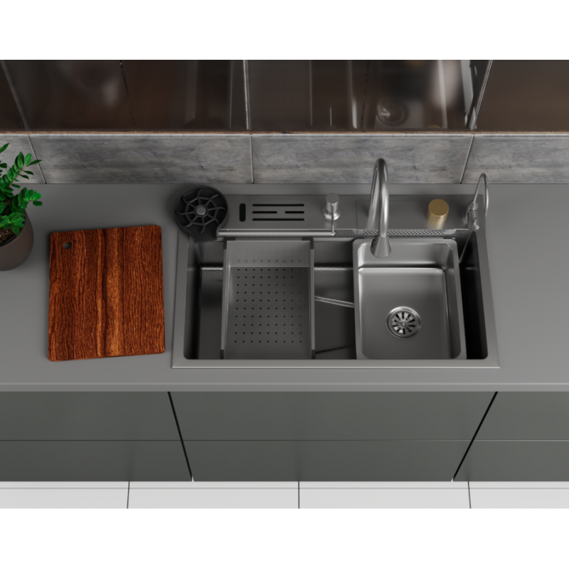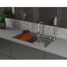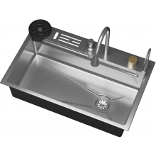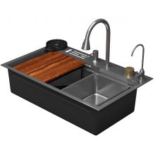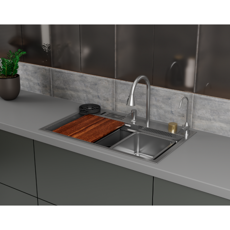 Многофункциональные мойки кухонные сделаны вручную из высококачественной нержавеющей стали SUS304, обработанной холодом для придания изделию прочности. Мойки идеально выдерживают перепады температуры, практичны и износостойки. Стальные мойки экологичны, гипоаллергенны и обладают отличной шумоизоляцией. Поверхность мойки - брашированная. Во время процесса браширования ворсинки щетки двигаются по поверхности мойки, что создает равномерную текстуру с узором с легким блеском. Одно из главных преимуществ брашировки поверхности мойки состоит в том, что на ней практически не заметны следы воды и мелкие царапины. В комплект стальной мойки входит - чаша мойки, смеситель с вытяжной лейкой и гибкой подводкой 60см 2шт, кран для подключения к фильтру, сифон, выпуск с переливом, корзина нерж.сталь 2шт, дозатор для мыла, доска разделочная, ринзер для мойки стаканов с гибкой подводкой 60см 1шт, встраиваемый футляр для ножей, паспорт изделия. Стальные мойки из нержавеющей стали гармонично впишутся в любой интерьер современной кухни. Основные преимущества моек из стали: высокое качество, приемлемая цена и полный комплект аксессуаров..