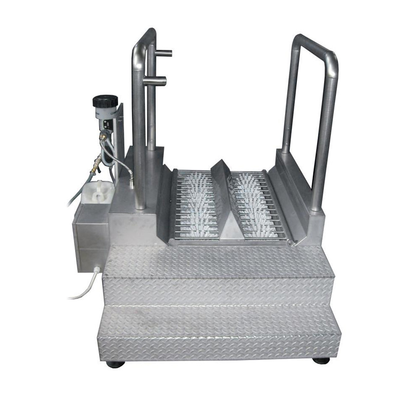 Принцип работы: дезраствор на подошвы обуви поступает с вращающихся щеток, которые включаются автоматически при прохождении персонала. Концентрация и количество поступающего дезраствора поддерживается автоматически.