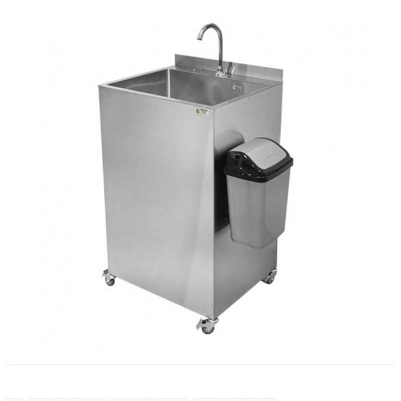Данное изделие выполнено и из пищевой нержавеющей стали марки AISI 304, оснащено помпой и двумя сменными резервуарами для чистой и использованной воды, объемом 20 литров каждый, что позволяет использовать рукомойник в условиях, где нет центрального водоснабжения. Данное изделие удобно в использовании, оснащено двумя колесами для перемещения рукомойника.