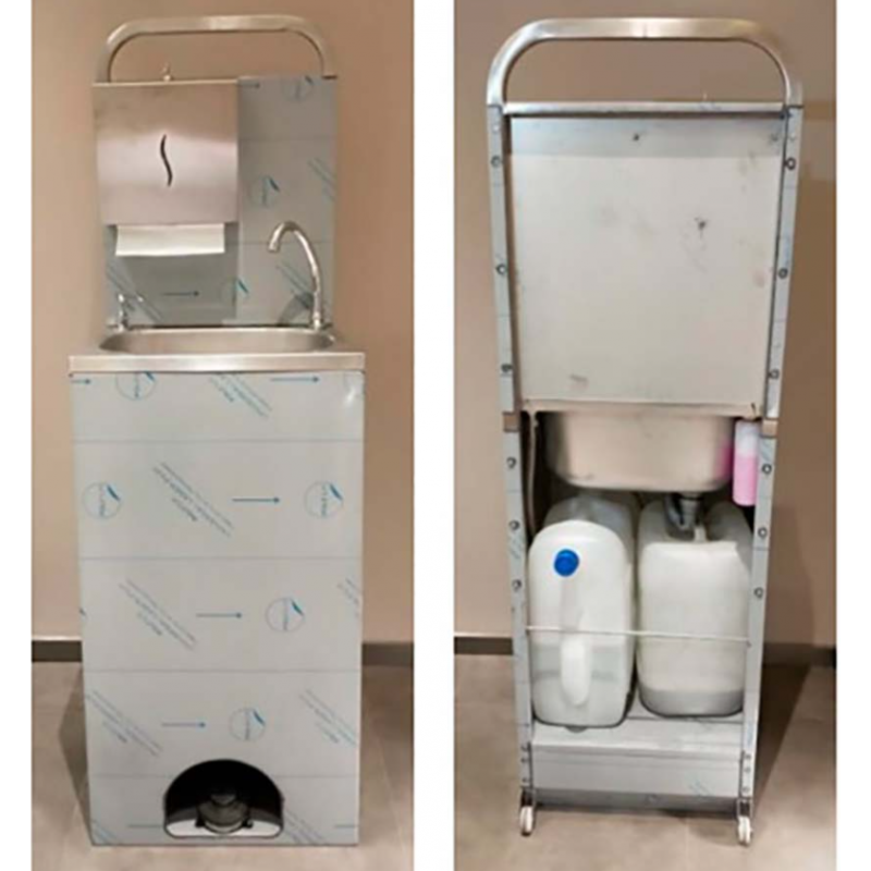 Данное изделие выполнено и из пищевой нержавеющей стали марки AISI 304, оснащено помпой и двумя сменными резервуарами для чистой и использованной воды, объемом 20 литров каждый, что позволяет использовать рукомойник в условиях, где нет центрального водоснабжения. Данное изделие удобно в использовании, оснащено двумя колесами для перемещения рукомойника.