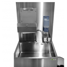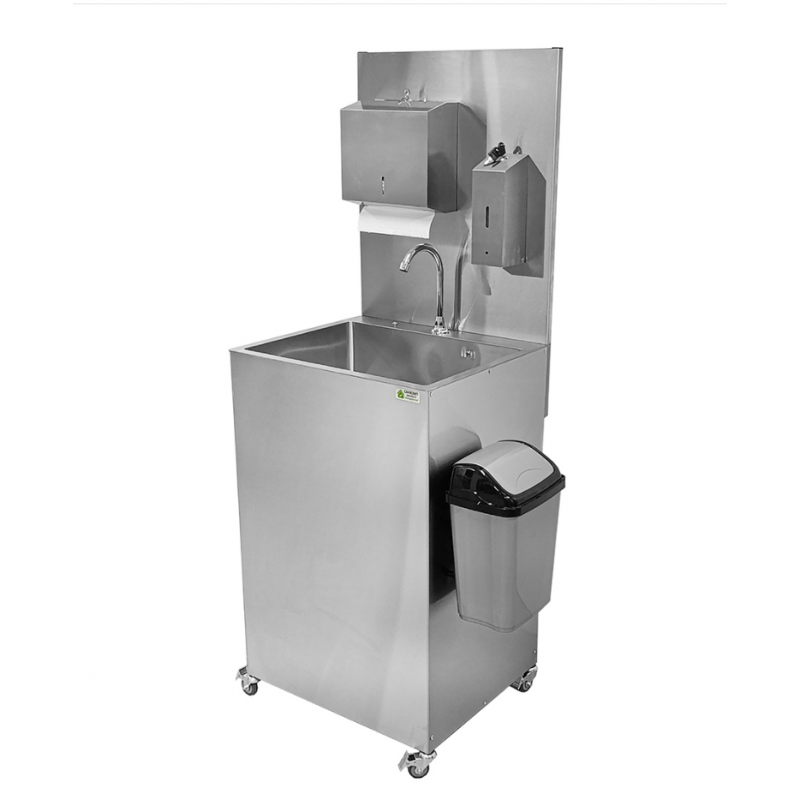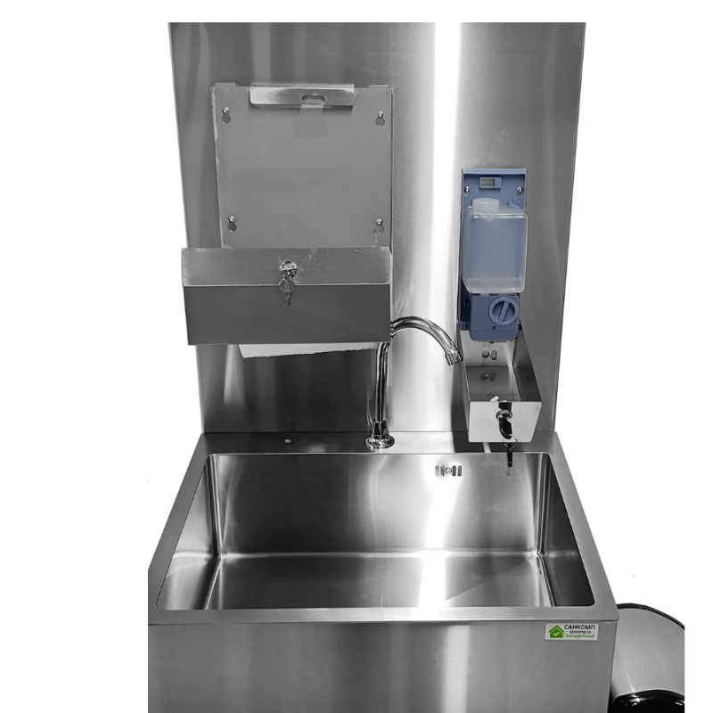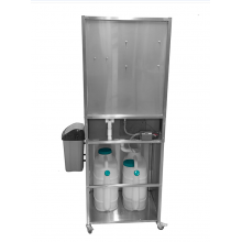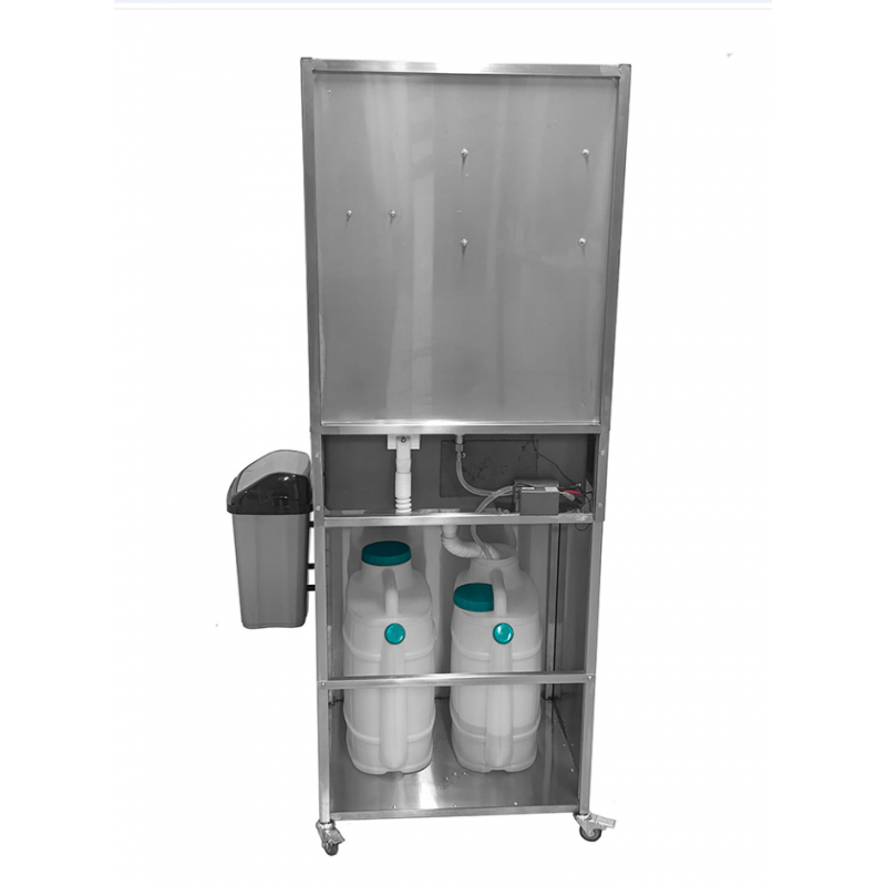 Данное изделие выполнено и из пищевой нержавеющей стали марки AISI 304, оснащено помпой и двумя сменными резервуарами для чистой и использованной воды, объемом 20 литров каждый, что позволяет использовать рукомойник в условиях, где нет центрального водоснабжения. Данное изделие удобно в использовании, оснащено двумя колесами для перемещения рукомойника.