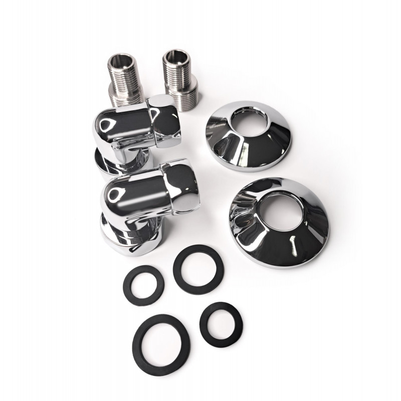 Комплект для подключения полотенцесушителя. Выполнен из латуни. Цвет хром, безупречный блеск изделию обеспечивает электрохимическая полировка. В комплект входит: 2 угловых соединения, эксцентрики 2 шт, 2 отражателя и 2 уплотнительных кольца.