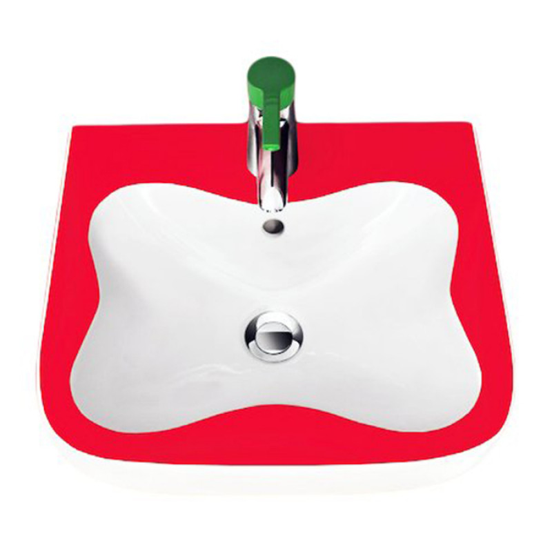 Раковина выполнена в форме забавного цветка, где основной цвет — классический белый, а декоративный элемент, обрамляющий отверстие для смесителя, — ярко-зеленый. Такое цветовое решение не только привлекает внимание ребенка и мотивирует его к самостоятельным гигиеническим процедурам, но и становится свежим акцентом в интерьере.