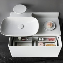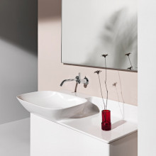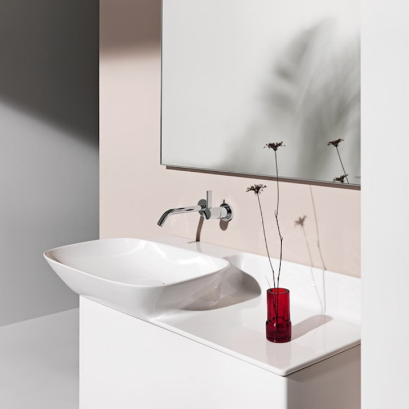 Раковина Laufen INO, разработанная французским дизайнером Тоаном Нгуеном, является ярким примером функционального и одновременно изысканного дизайна. Ее главная особенность — асимметричная композиция, где овальная чаша смещена влево, а справа образуется удобная и широкая керамическая полка (крыло). Это пространство идеально подходит для размещения мыла, дозатора, стакана или других аксессуаров.