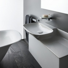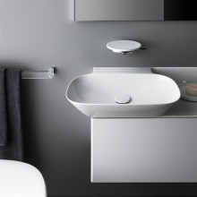 Раковина Laufen INO, разработанная французским дизайнером Тоаном Нгуеном, является ярким примером функционального и одновременно изысканного дизайна. Ее главная особенность — асимметричная композиция, где овальная чаша смещена влево, а справа образуется удобная и широкая керамическая полка (крыло). Это пространство идеально подходит для размещения мыла, дозатора, стакана или других аксессуаров.