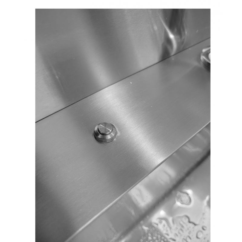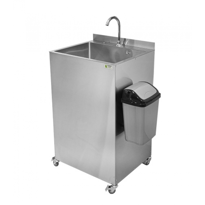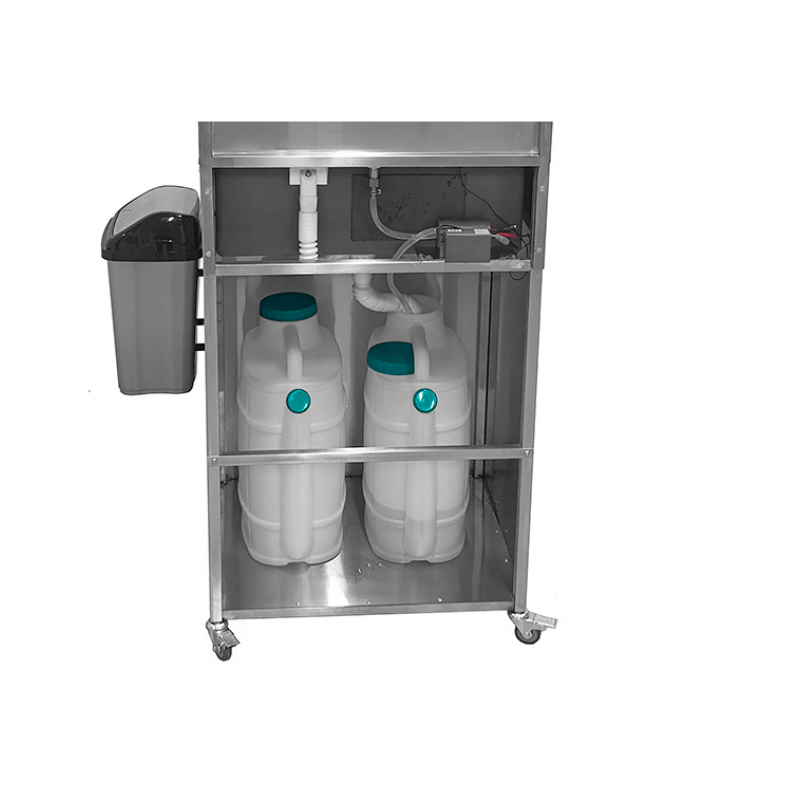 Данное изделие выполнено и из пищевой нержавеющей стали марки AISI 304, оснащено помпой и двумя сменными резервуарами для чистой и использованной воды, объемом 20 литров каждый, что позволяет использовать рукомойник в условиях, где нет центрального водоснабжения. Данное изделие удобно в использовании, оснащено двумя колесами для перемещения рукомойника.